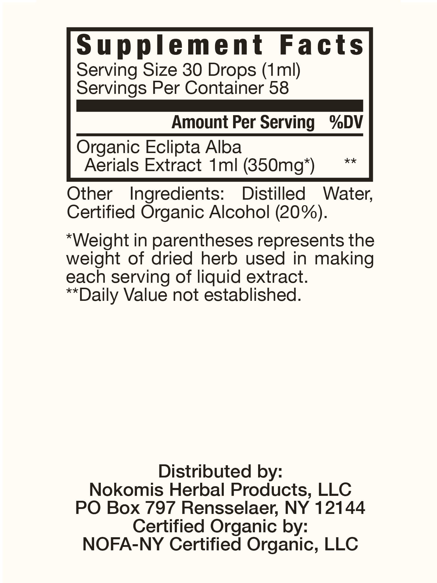 Organic Sustainably Grown Dried Eclipta Alba Aerials, Distilled Water, Organic Alcohol (20-25%)