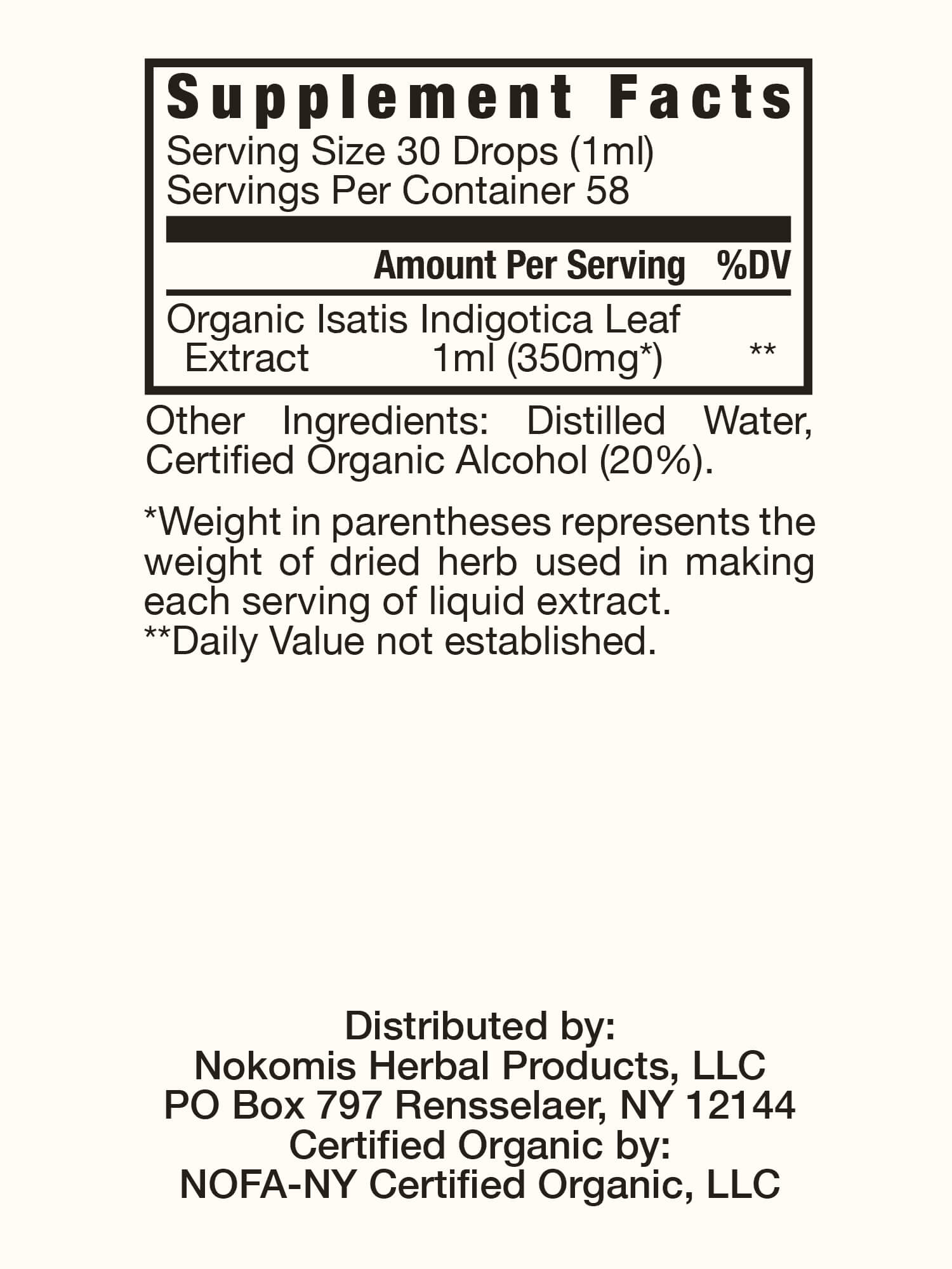 Organic Sustainably Grown Dried Isatis Indigotica Leaf, Distilled Water, Organic Alcohol (20-25%)