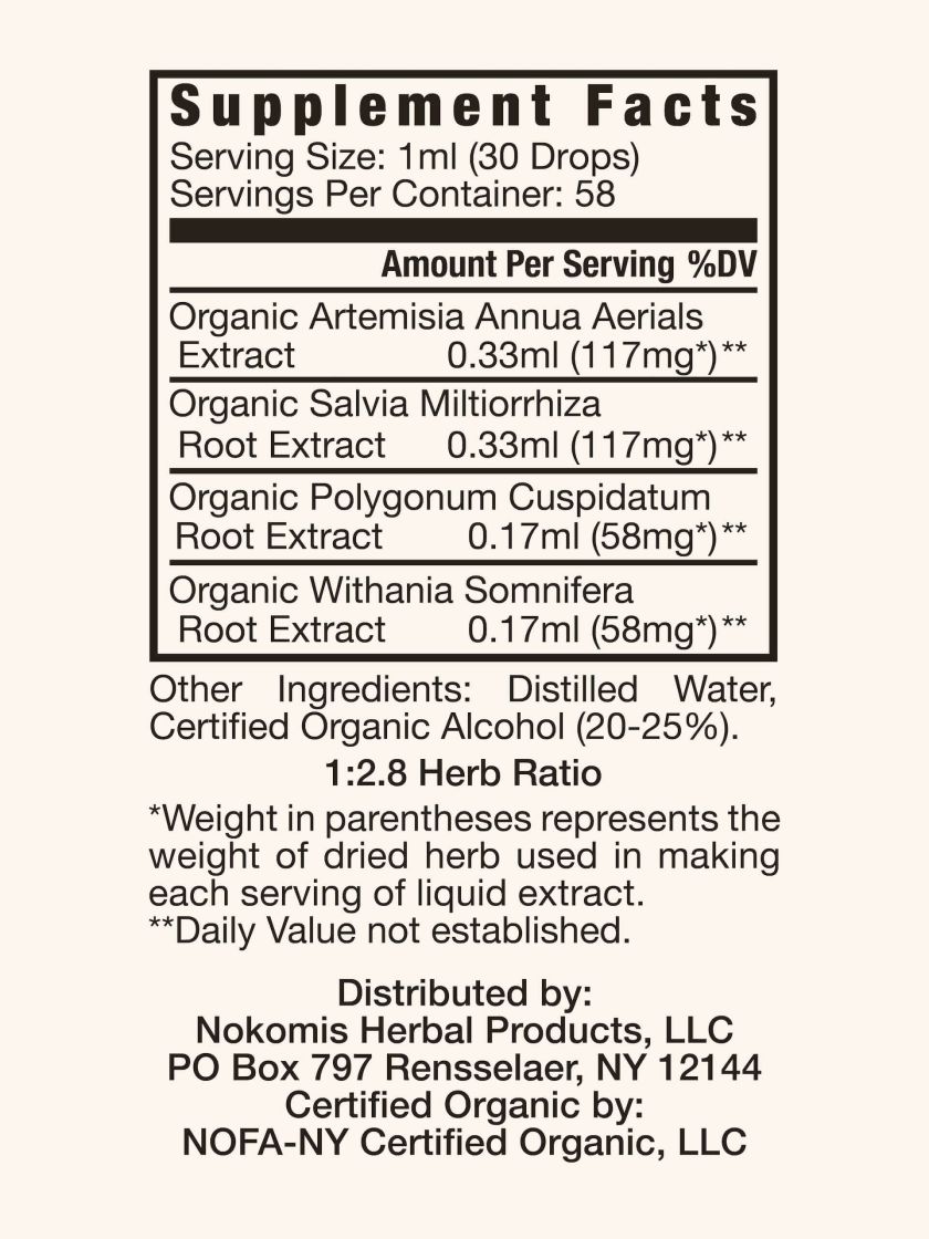 Dried Organic Artemisia Annua Aerials, Dried Organic Salvia Miltiorrhiza (Dan Shen) Root, Dried Organic Withania Somnifera (Ashwagandha) Root, Dried Organic Polygonum Cuspidatum (Japanese Knotweed) Root. All Sustainably Grown. Other Ingredients: Distilled Water, Organic Alcohol (20-25%)